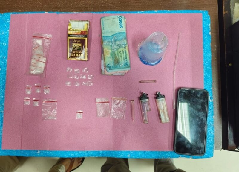 Barang bukti yang diamankan berupa 1 bungkus sabu seberat 0,11 gram, 5 bungkus sabu dengan berat total 0,59 gram, dan 1 bungkus sabu lagi seberat 0,56 gram. Selain itu, polisi juga menyita 11 plastik klip bekas pakai, 1 bal plastik kosong, 2 plastik klip ukuran sedang, 1 bong, 2 mancis, 1 kaca pirex, 1 pipet plastik, 1 pipet yang sudah dimodifikasi, uang tunai Rp339 ribu, dan 1 unit ponsel Vivo warna hitam.