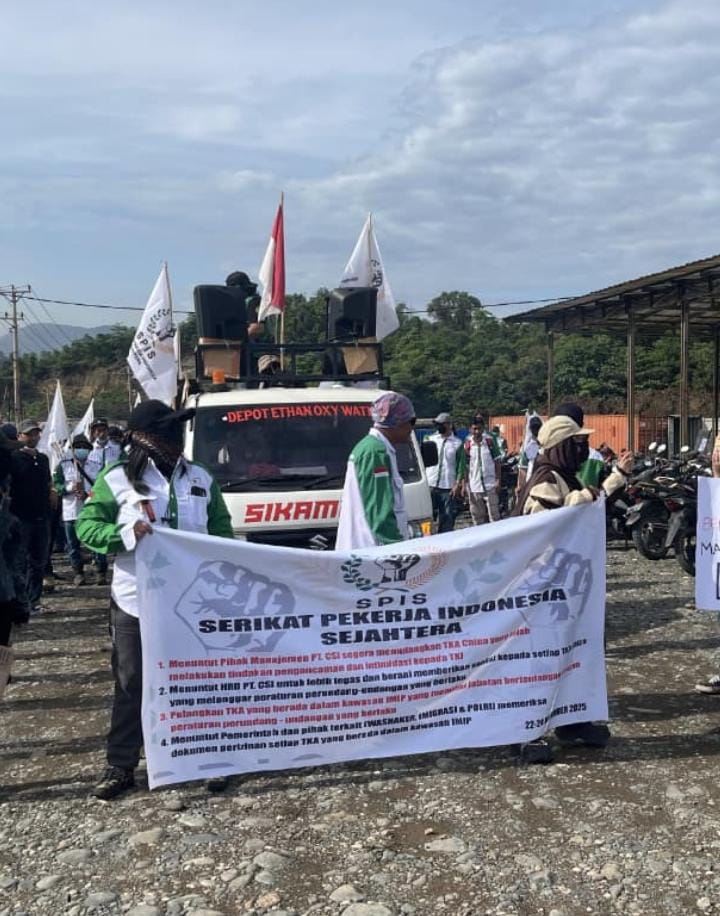 Aksi unjukrasa yang dipimpin Markus Yunus sebagai Jendral Lapangan (Jenlap) menyampaikan sejumlah tuntutan kepada salah satu perusahaan Tenant di dalam Kawasan IMIP, yakni PT. Cahaya Smelter Indonesia (CSI) terkait tindakan pengancaman dan intimidasi terhadap TKI dilingkungan kerjanya.