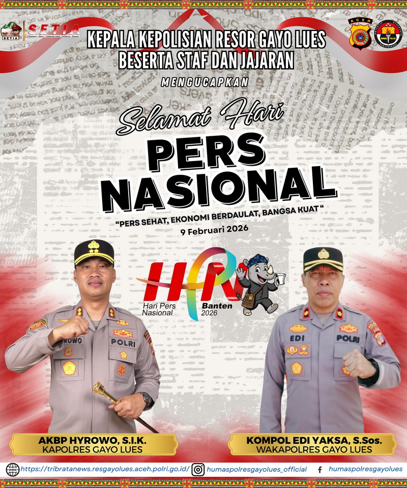 Melalui sebuah ucapan resmi yang dirilis pada Senin (9/2), Kepala Kepolisian Resor Gayo Lues AKBP Hyrowo, S.I.K., bersama Wakil Kepala Kepolisian Resor Kompol Edi Yaksa, S.Sos., serta seluruh staf dan jajaran, menyampaikan apresiasi atas dedikasi dan kontribusi insan pers dalam menyampaikan informasi yang akurat, berimbang, dan mencerdaskan masyarakat. Ucapan tersebut disampaikan dengan semangat kebersamaan, menghormati kebebasan pers sebagai pilar keempat demokrasi, sekaligus memperkuat kerja sama yang konstruktif antara lembaga kepolisian dan media massa.
