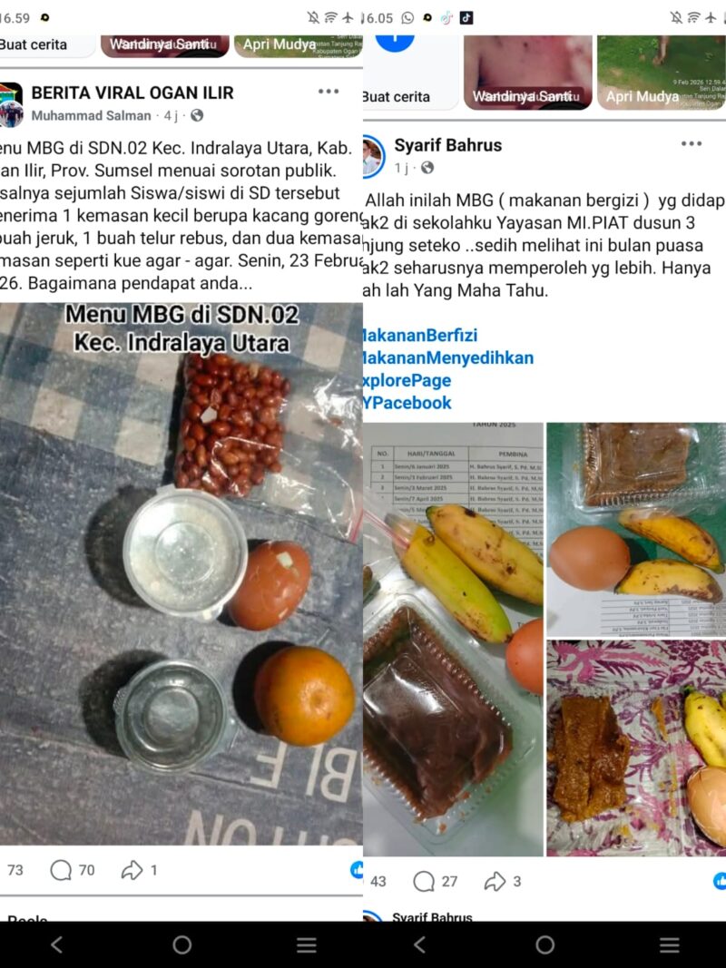 Tak berselang lama, akun Muhammad Salman juga mengunggah menu MBG di SDN 02 Kecamatan Indralaya Utara.